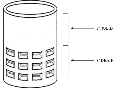 A typical drop drain is 6'+ in height and consists of 3'+ solid part and a 3'+ drain part. Drop drain is installed under the main drywell so that it's drain part ensures liquid evacuation to permeable stratum or porous subsoil.